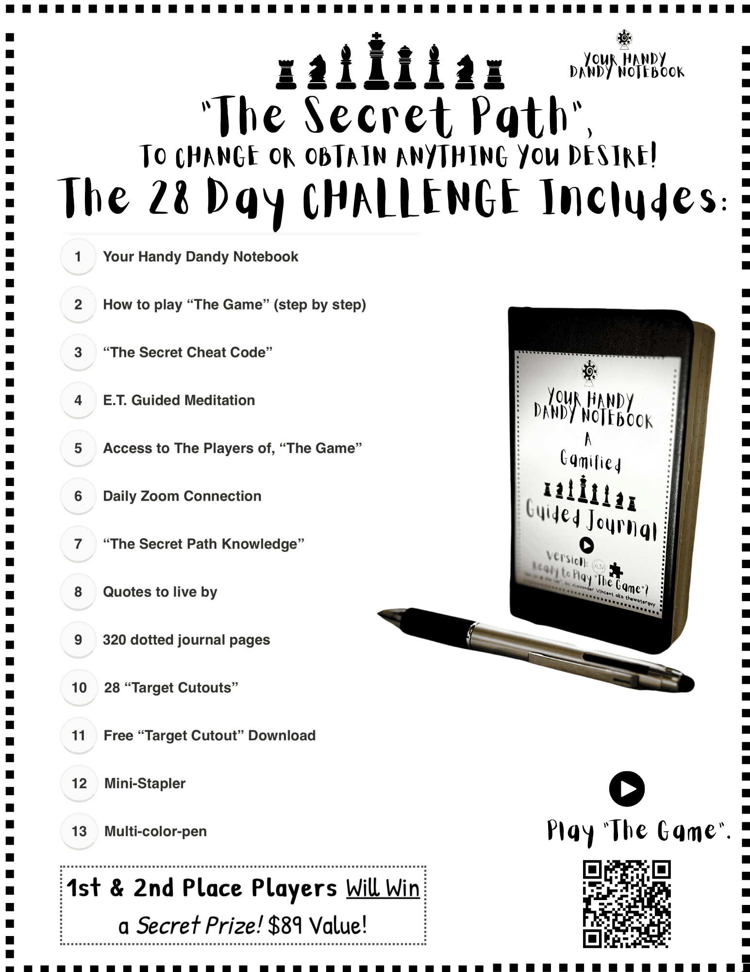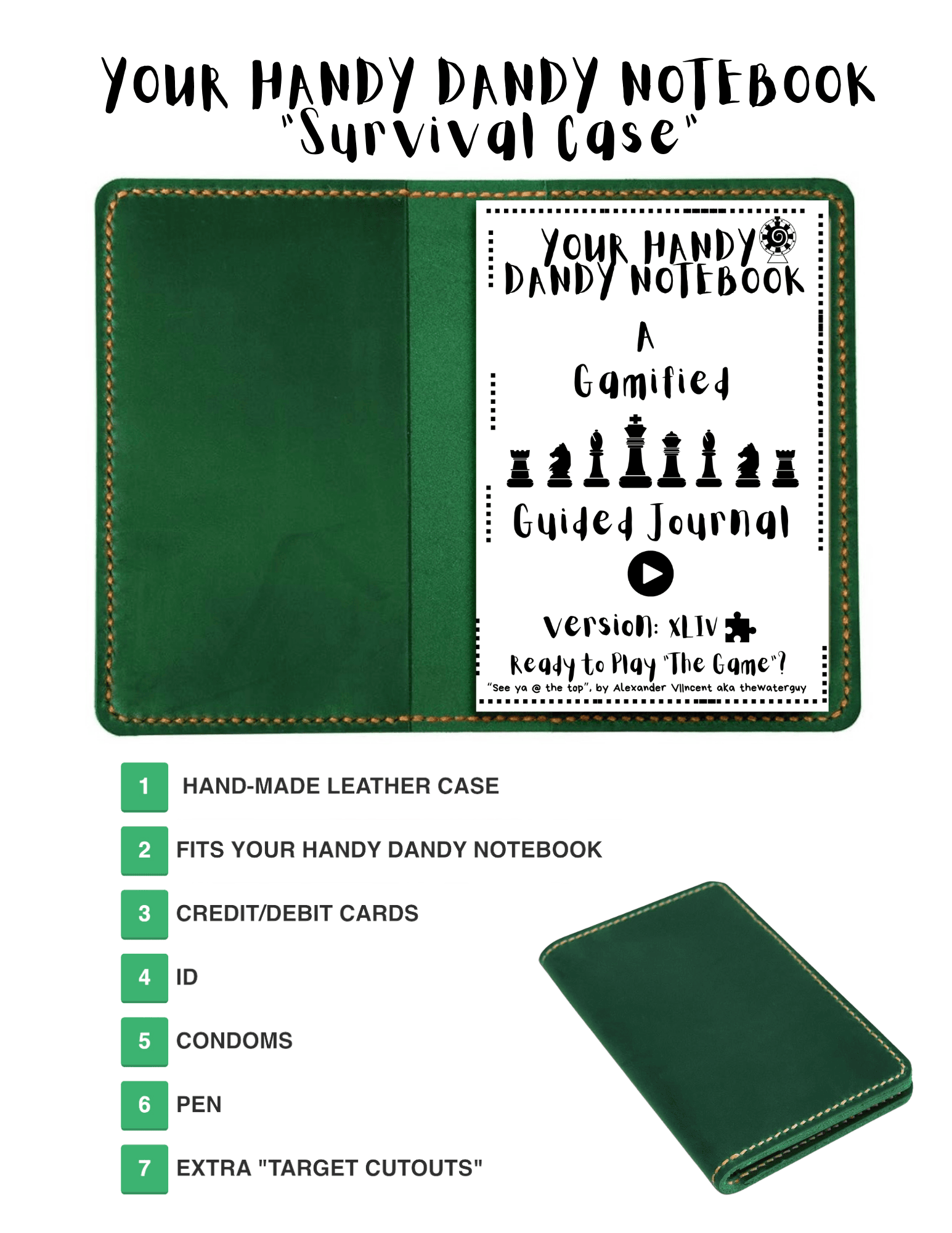 : (50 % Discount Website Price $89! Thank you for Playing "The Game" & Embarking on a journey to learn the secret path knowledge. Personally the "survival case", has changed my life as well as your handy dandy notebook obviously but this Hand Made Leather Case for me is Por Vida (for life)!